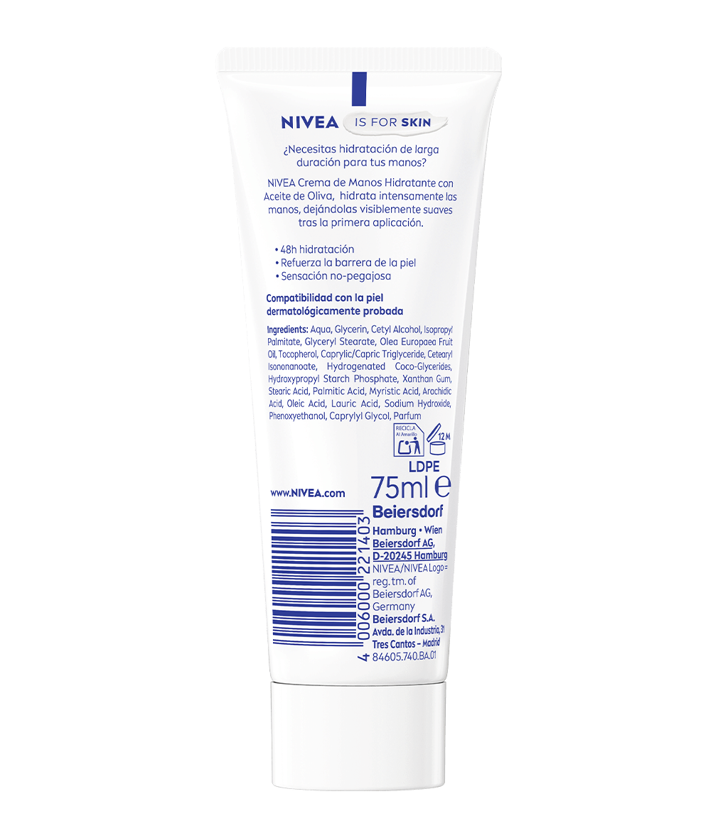 NIVEA Crema de Manos Hidratante con Aceite de Oliva hidrata intensamente durante 48h, refuerza la barrera de la piel y deja las manos visiblemente suaves después de la primera aplicación.
