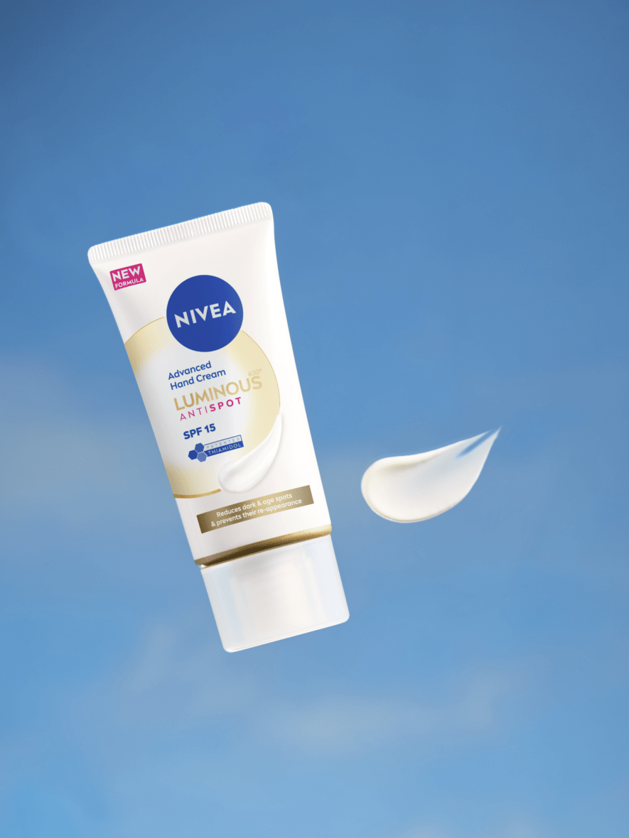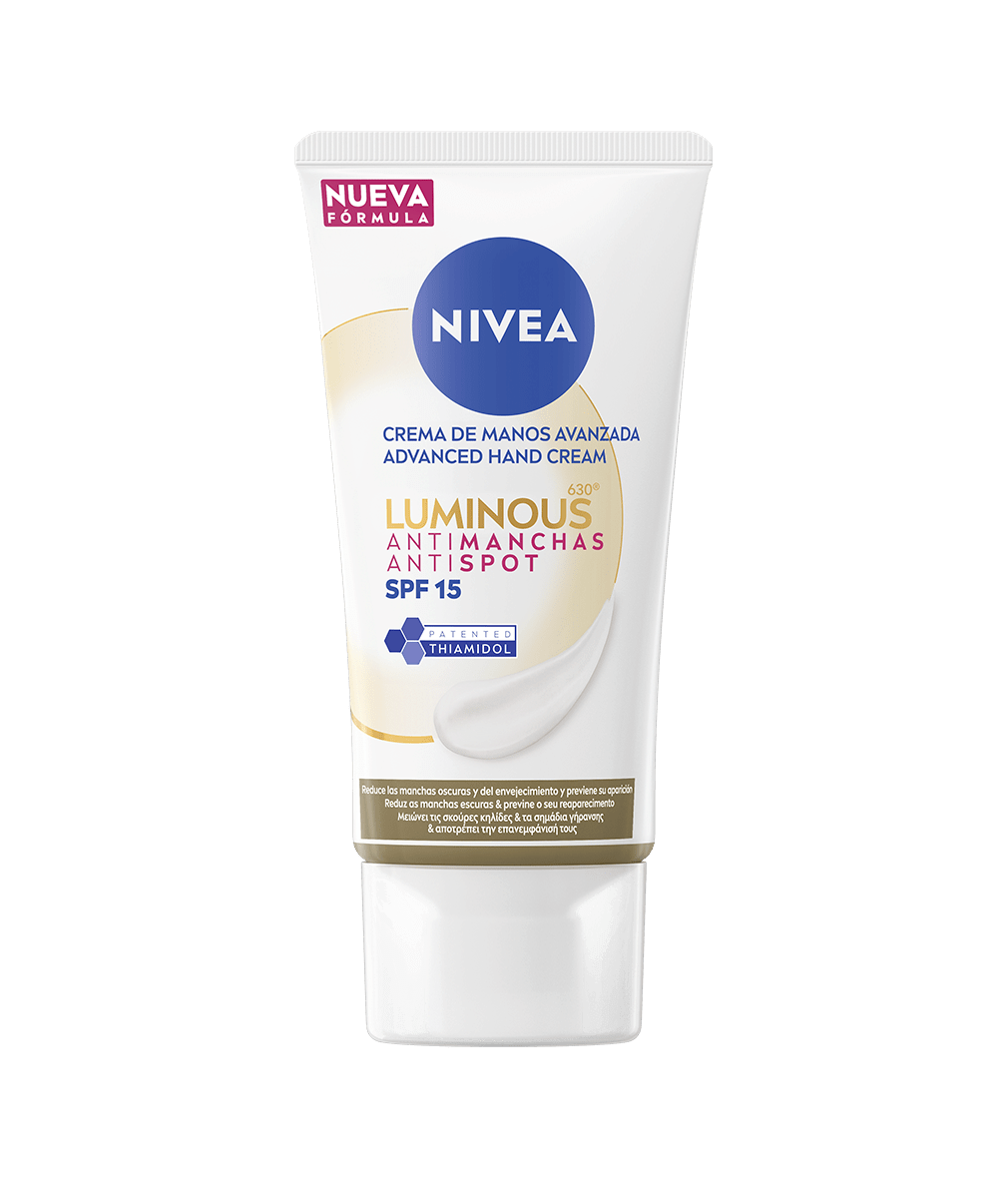 NIVEA Luminous630 Antimanchas Crema de Manos, ahora con una nueva fórmula que contiene Thiamidol® y SPF 15, en 4 semanas reduce visiblemente las manchas oscuras y equilibra la pigmentación para prevenir su aparición. Piel uniforme y luminosa. Hidrata intensamente las manos secas durante 48 horas.