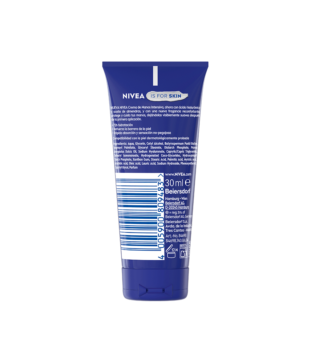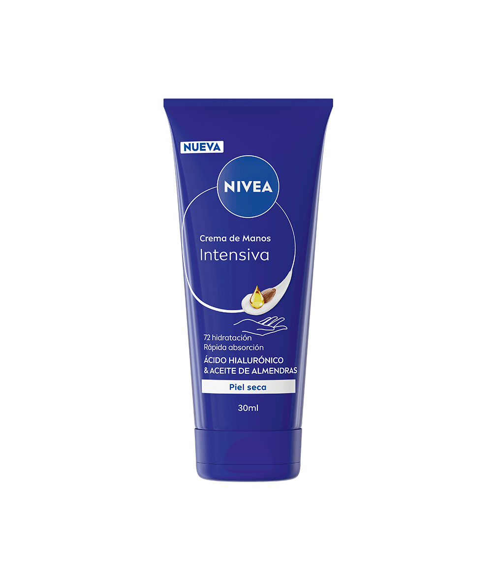 NIVEA Crema de Manos Intensiva, ahora con una nueva fórmula que contiene ácido hialurónico y aceite de almendras, y con una nueva fragancia reconfortante, protege y cuida tus manos, dejándolas visiblemente suaves después de la primera aplicación. Formato mini de 30ml para llevar a donde quieras.