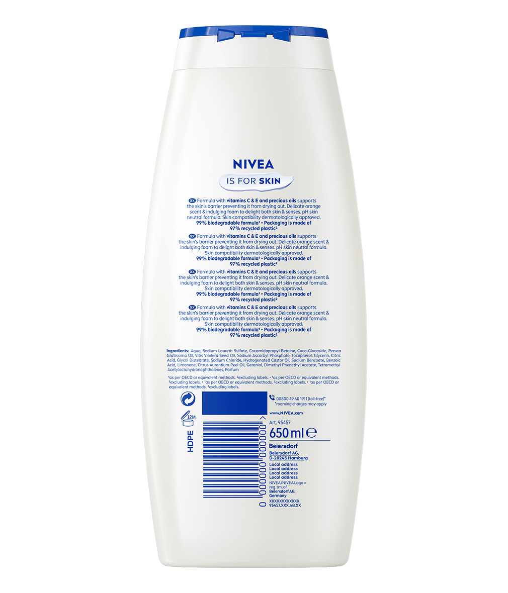 El Gel de ducha NIVEA Care & Orange deja tu piel suave y cuidada. Su fórmula con Vitaminas C y E y aceites nutritivos cuidan la piel y evitan que se reseque. Con suave aroma a naranja y pH neutro para la piel. Compatibilidad con la piel dermatológicamente probada.