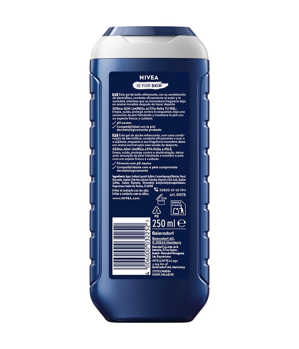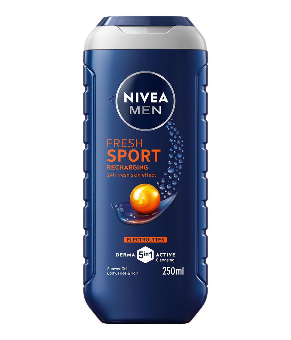 El Gel de ducha NIVEA MEN Fresh Sport, con su combinación de electrolitos, combate eficazmente el sudor y la suciedad, mientras que su fragancia deja un aroma increíble. Se puede utilizar en cuerpo, cara o pelo y proporciona 24h de efecto en la piel. pH neutro y fórmula dermatológicamente probada.