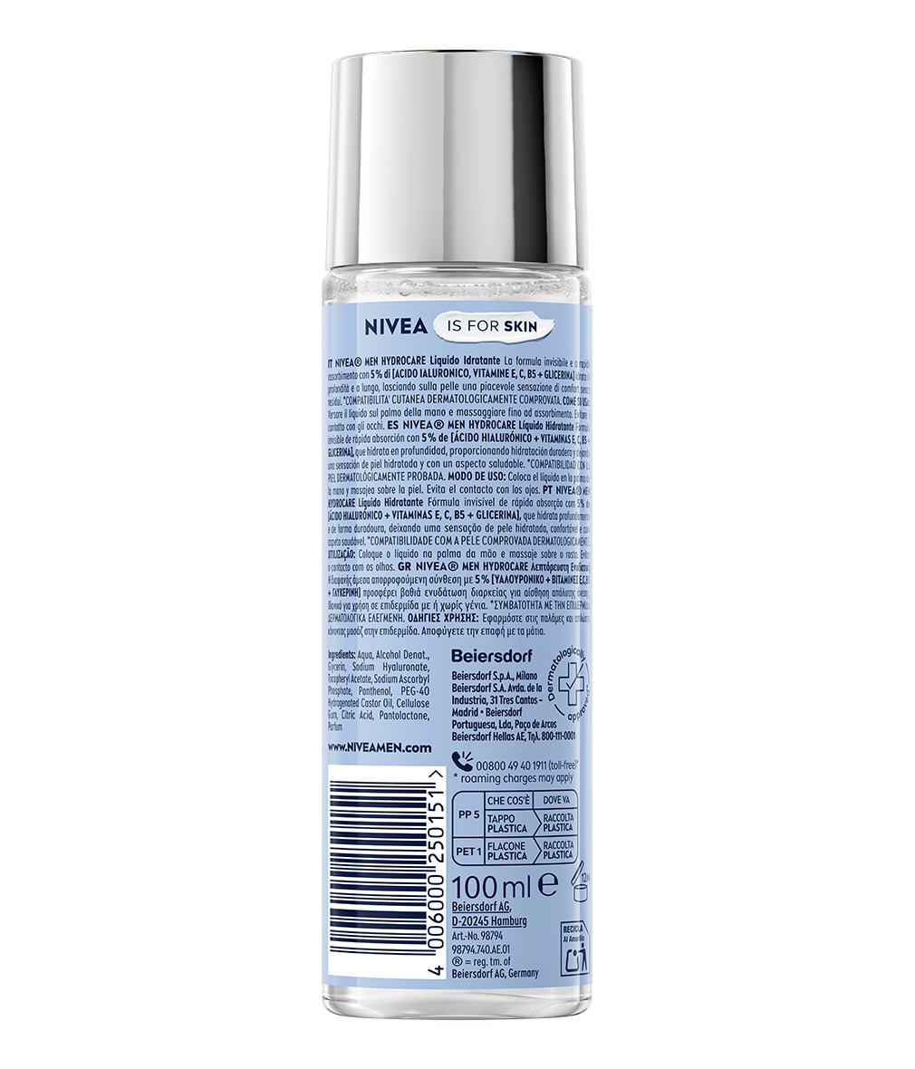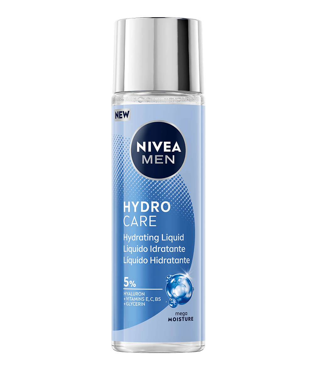 NIVEA MEN Hydrocare Líquido Hidratante: su fórmula invisible de absorción inmediata, potenciada con el Complejo Hidratación Avanzada 5% (que incluye Ácido Hialurónico + Vitaminas E, C y B5 y Glicerina), hidrata profundamente y de forma prolongada la piel del rostro, dejando únicamente una sensación de confort en la piel.