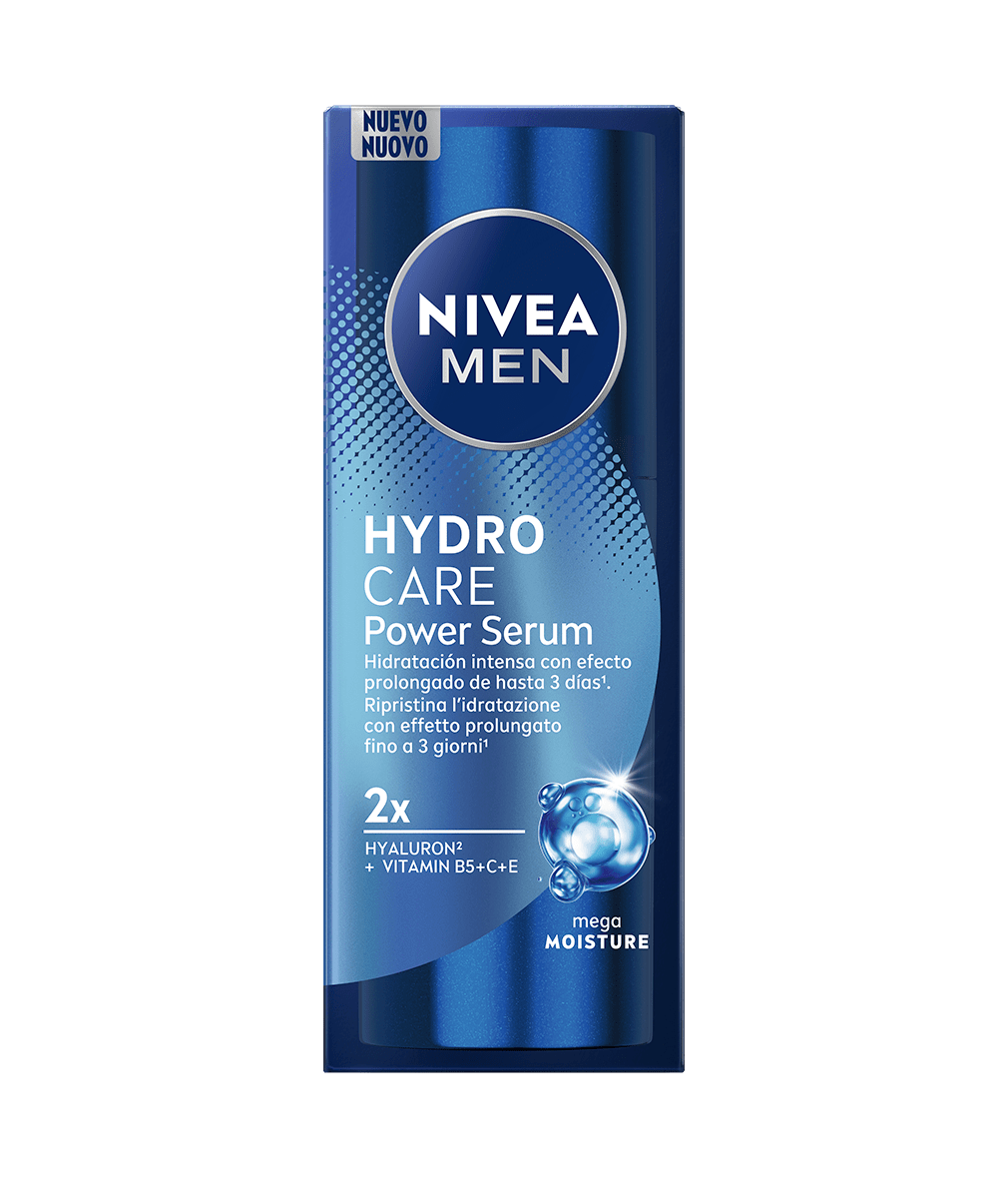 NIVEA MEN Hydrocare Power Serum aporta una hidratación intensa y duradera a tu rostro durante 3 días. Penetra en las capas más profundas de la epidermis para aportar hidratación sin sensación pesada para una piel hidratada, revitalizada y llena de energía. Su fórmula refrescante y de rápida absorción está potenciada con 2X Ácido Hialurónico (2) + Vitaminas B5, C y E. Proporciona 72 h de hidratación tras una única aplicación: el Macro-Ácido Hialurónico hidrata intensamente la superficie de la piel, y el Micro-Ácido Hialurónico penetra en capas más profundas para rellenar los depósitos de hidratación de la piel. Resultado clínicamente probado y recomendado por hombres*: previene la sequedad con +140 % de hidratación tras 1 sola aplicación.