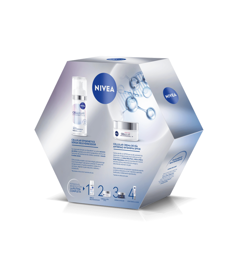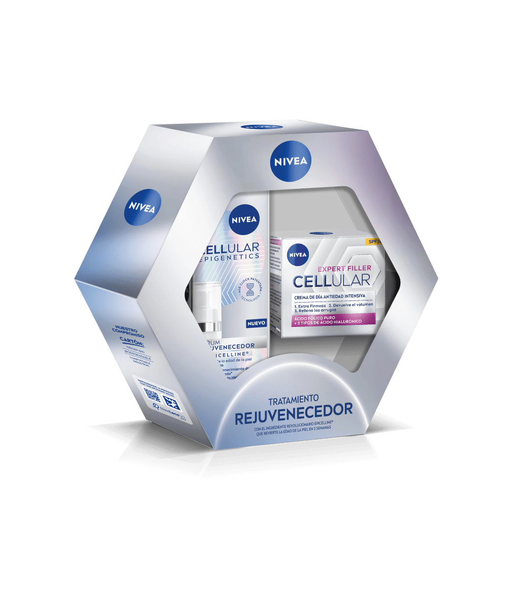 Descubre este pack NIVEA para ofrecerle a tu piel un tratamiento rejuvenecedor: comienza tu rutina con el sérum NIVEA Cellular Epigenetics Sérum Rejuvenecedor, que revierte la edad de la piel en 2 semanas, y continúa con la Crema de Día Antiedad de NIVEA Cellular Expert Filler con SPF 30.