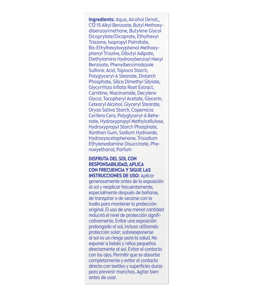Incluye: Aqua, Alcohol Denat., C12-15 Alkyl Benzoate, Butyl Methoxydibenzoylmethane, Butylene Glycol Dicaprylate/Dicaprate, Ethylhexyl Triazone, Isopropyl Palmitate, Bis-Ethylhexyloxyphenol Methoxyphenyl Triazine, Dibutyl Adipate, Diethylamino Hydroxybenzoyl Hexyl Benzoate, Phenylbenzimidazole Sulfonic Acid, Tapioca Starch, Polyglyceryl-6 Stearate, Distarch Phosphate, Silica Dimethyl Silylate, Glycyrrhiza Inflata Root Extract, Carnitine, Niacinamide, Decylene Glycol, Tocopheryl Acetate, Glycerin, Cetearyl Alcohol, Glyceryl Stearate, Oryza Sativa Starch, Copernicia Cerifera Cera, Polyglyceryl-6 Behenate, Hydroxypropyl Methylcellulose, Hydroxypropyl Starch Phosphate, Xanthan Gum, Sodium Hydroxide, Hydroxyacetophenone, Trisodium Ethylenediamine Disuccinate, Phenoxyethanol, Parfum