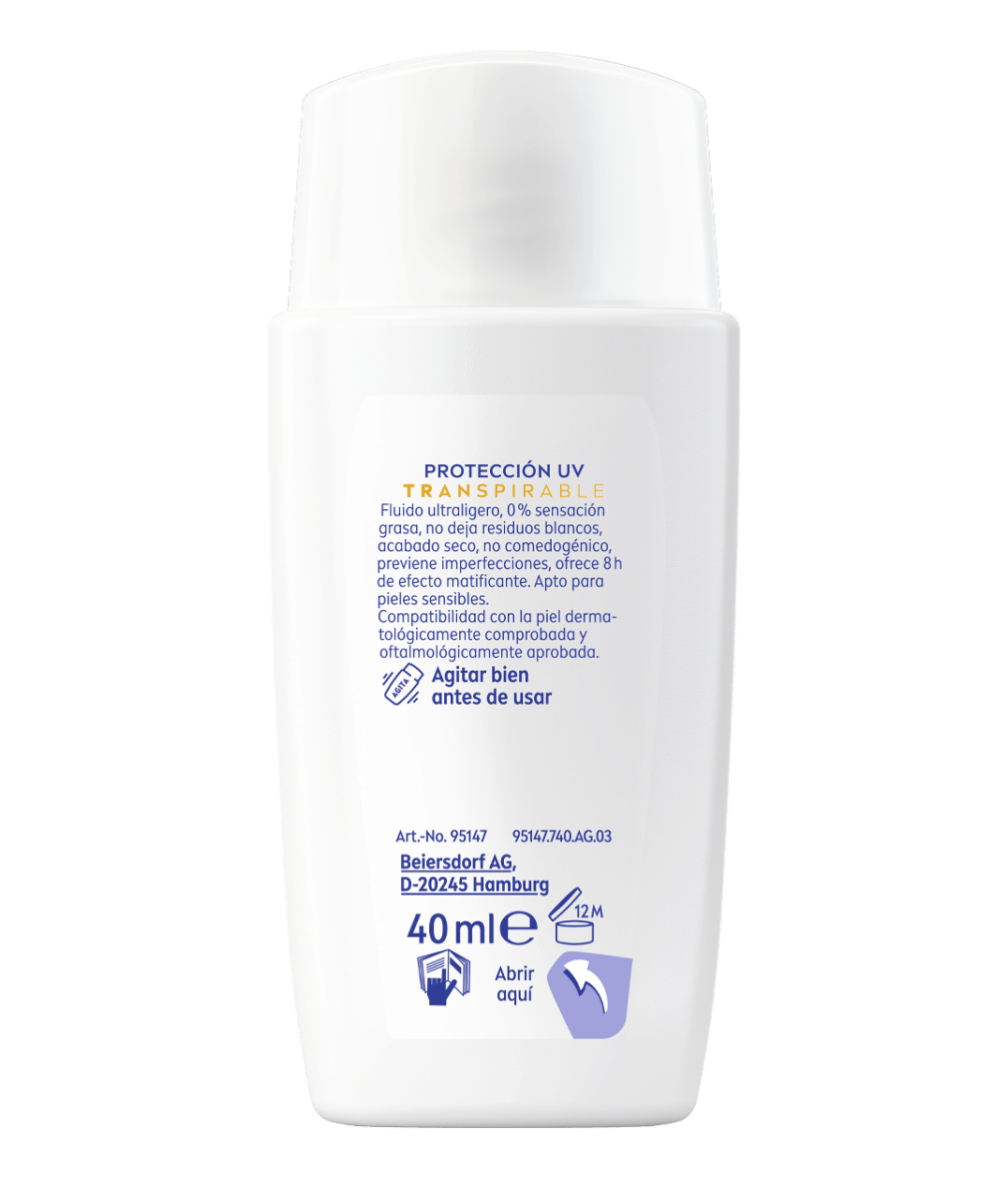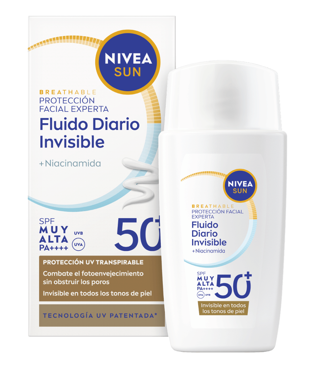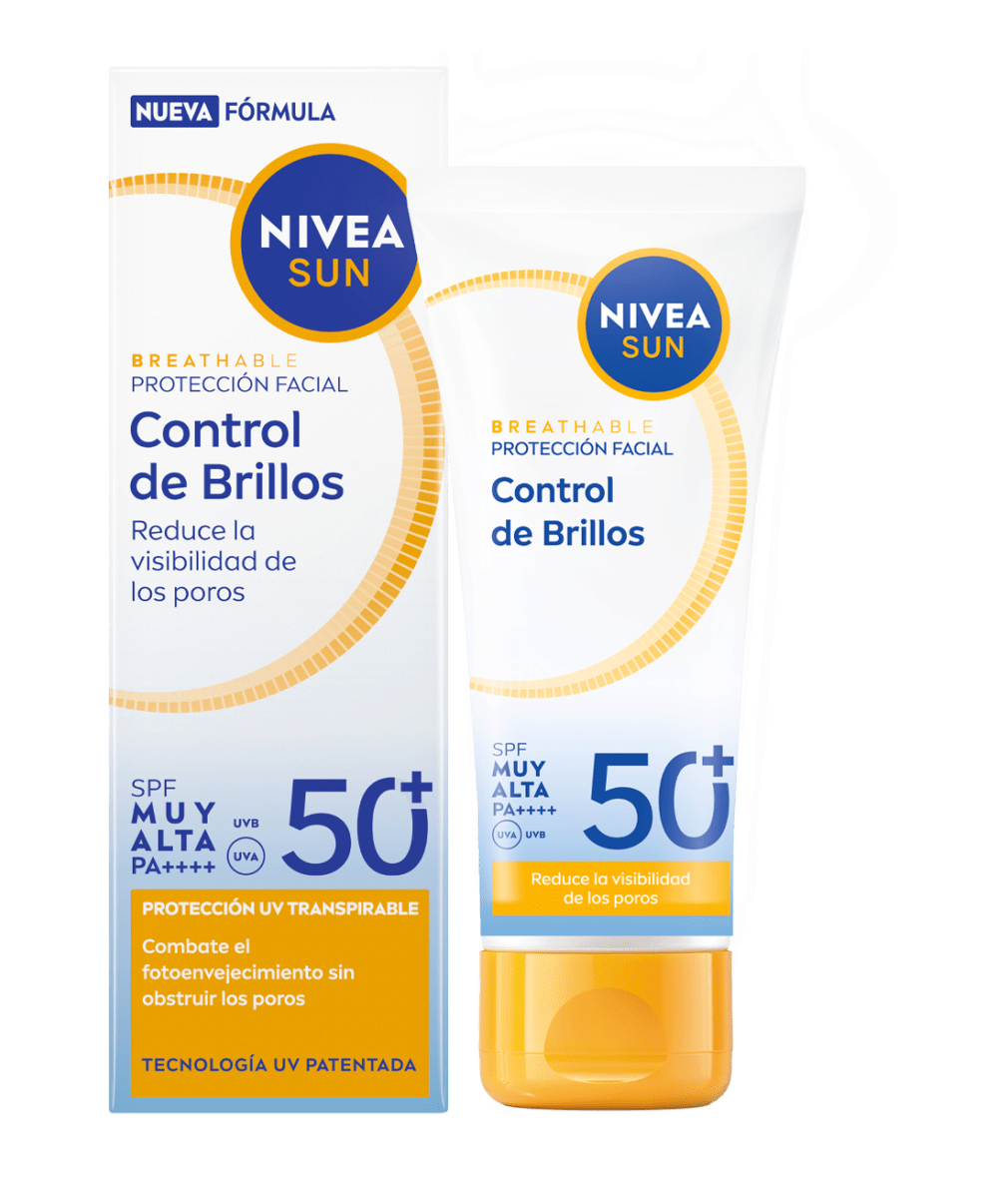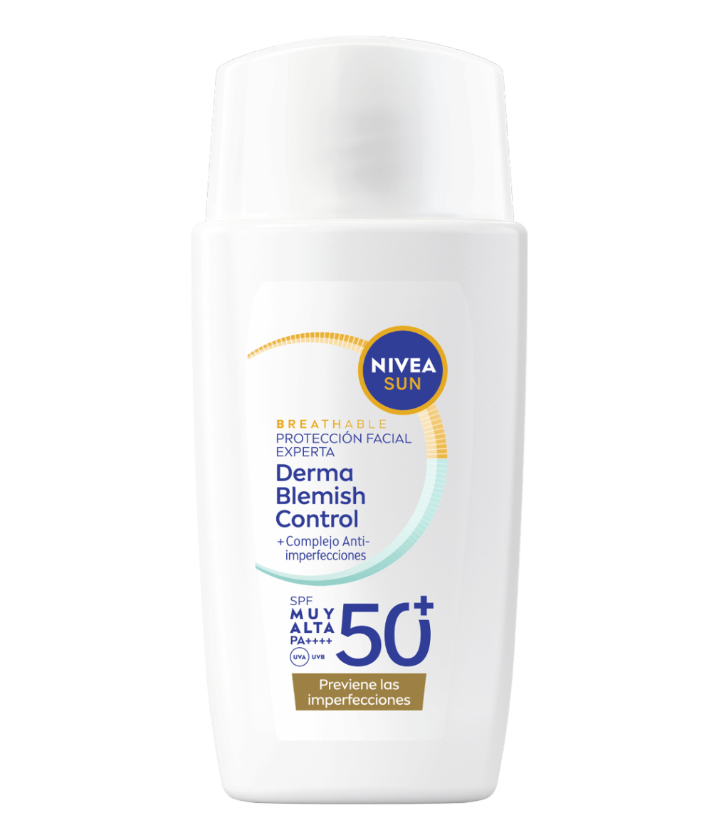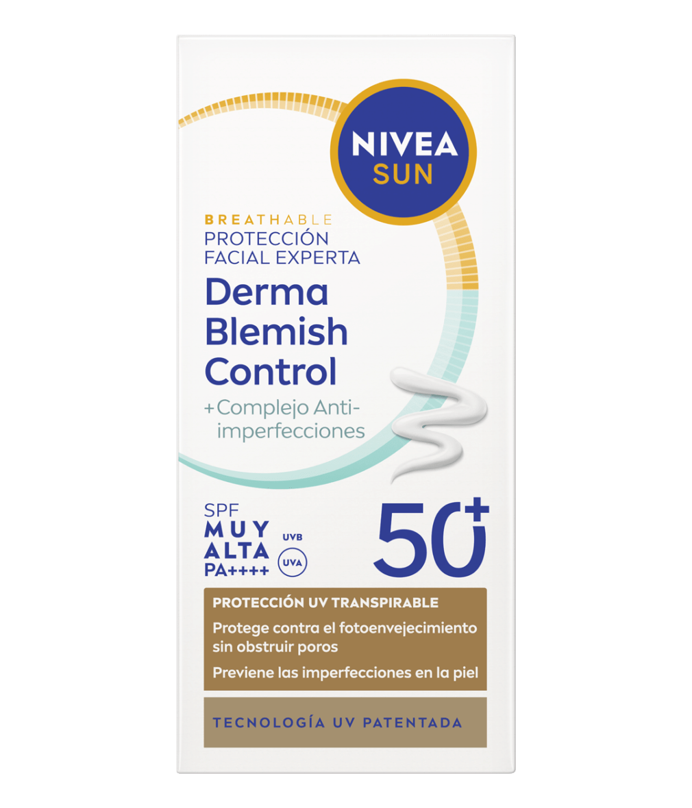 NIVEA SUN Protección Facial UV Experta Derma Blemish Control Transpirable SPF 50+ combate el fotoenvejecimiento sin obstruir los poros. Previene imperfecciones y proporciona un efecto mate de 8h