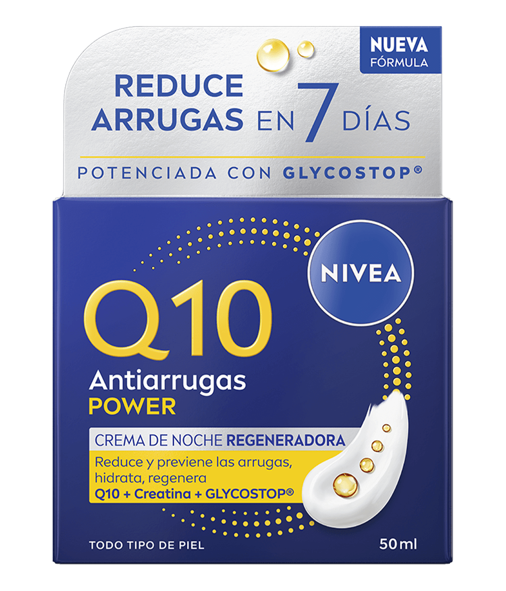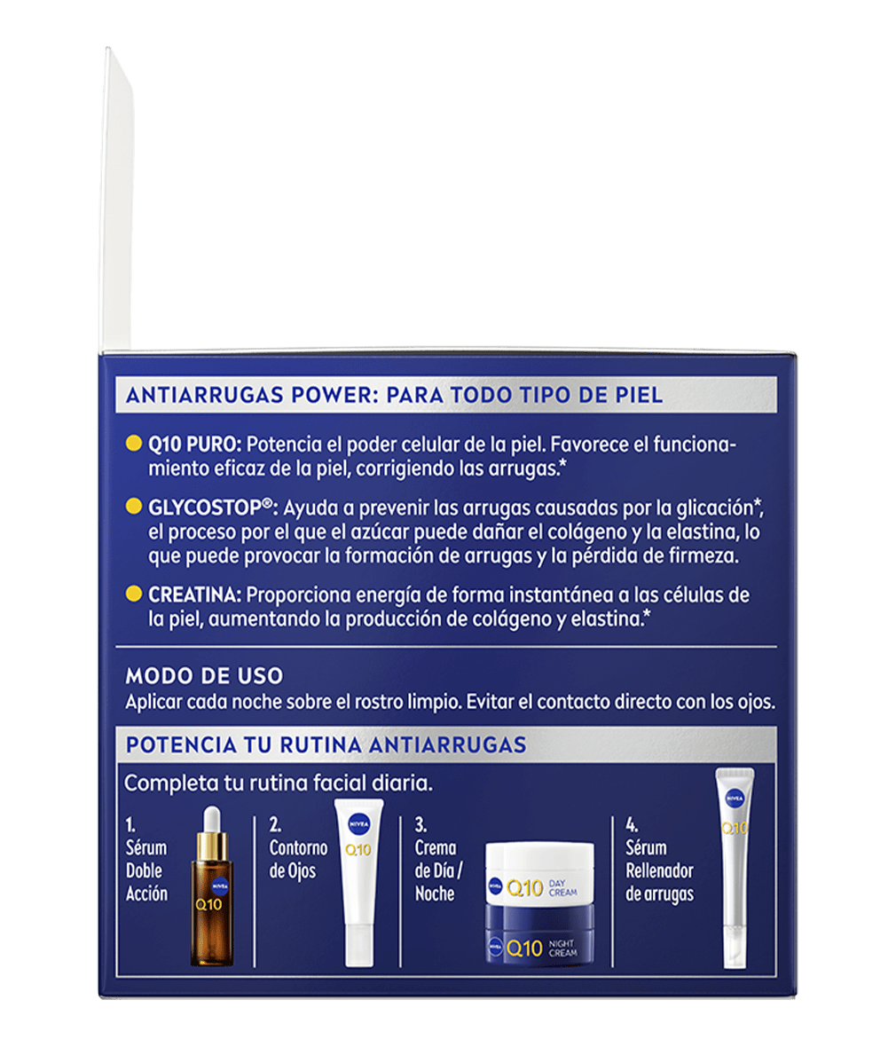 NIVEA Q10 Antiarrugas Power Crema de Noche Regeneradora está enriquecida con Coenzima Q10 de Doble Acción y Creatina para asegurar una Acción Antiarrugas 24h, para una piel visiblemente más firme y arrugas reducidas en 7 días.