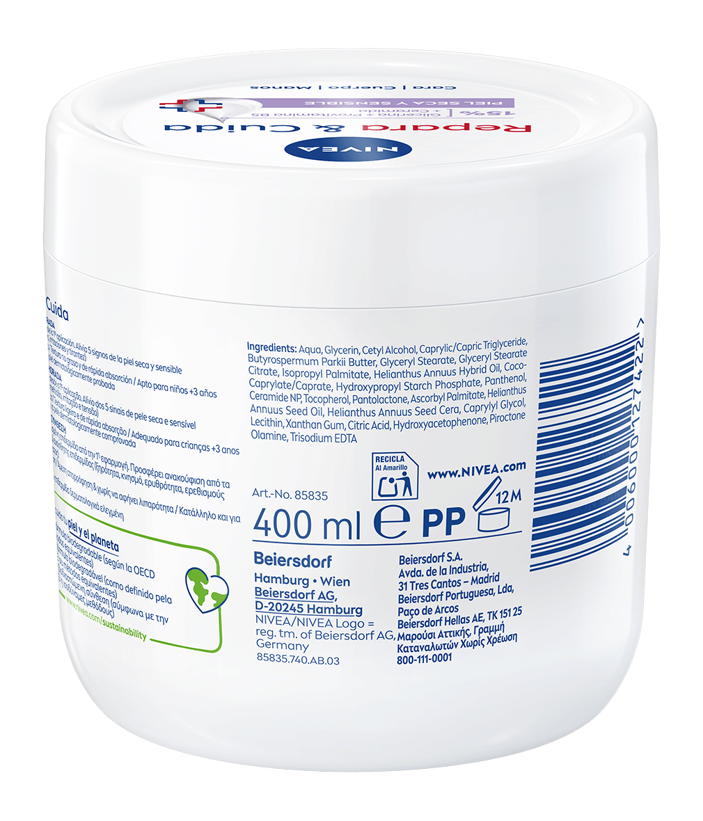 NIVEA Repara & Cuida Crema para Piel Sensible alivia la piel irritada desde la 1ª aplicación. Alivia los 5 signos de la piel seca y sensible (sequedad, picor, rojeces, irritaciones y tirantez) Fórmula hipoalergénica, textura no grasa y de rápida absorción, apto para niños a partir de 3 años.