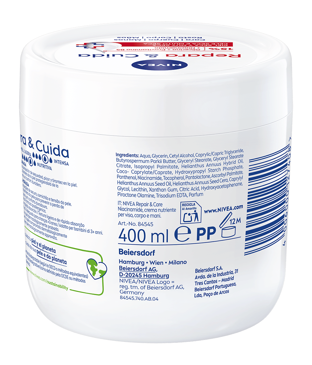 NIVEA Repara & Cuida Crema Intensiva ofrece alivio instantáneo de la sensación de sequedad, picor y tirantez en la piel. Su fórmula regenera y refuerza la barrera de la piel protegiéndola de la sequedad y proporciona un confort duradero. Hipoalergénica, no grasa y de absorción rápida.