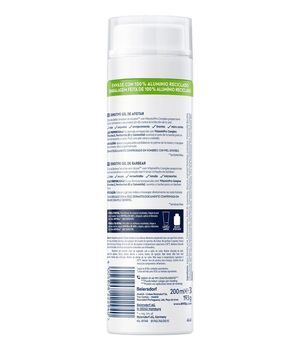 El Gel de Afeitar Sensitive, con una fórmula 99% biodegradable y 0% alcohol etílico, proporciona una protección instantánea contra los cinco signos de irritación del afeitado. Enriquecido con Camomila y Vitamina E, asegura un afeitado apurado y suave mientras mantiene la piel confortable y cuidada.